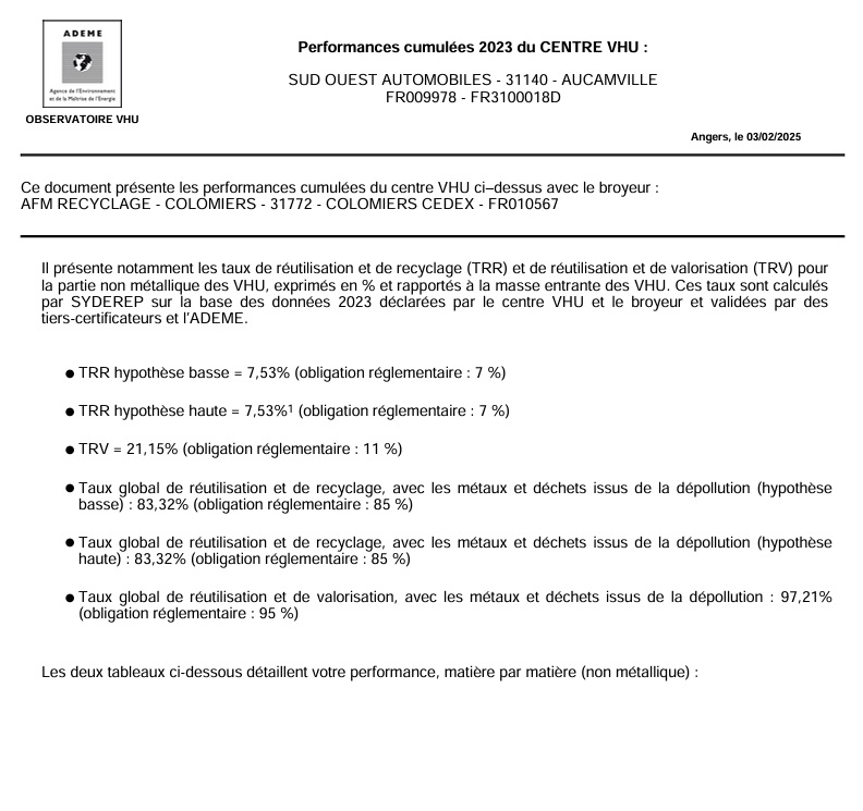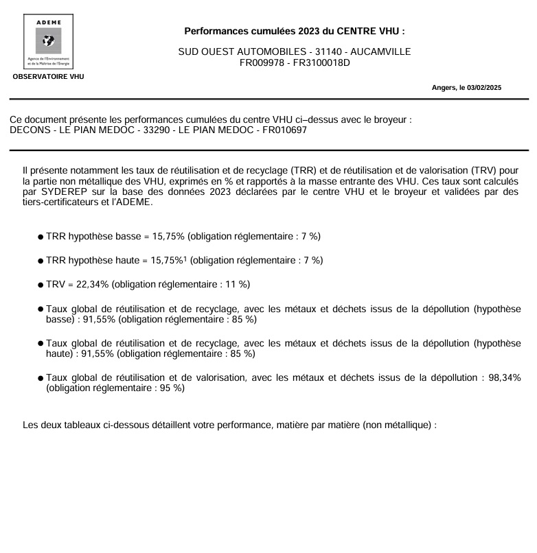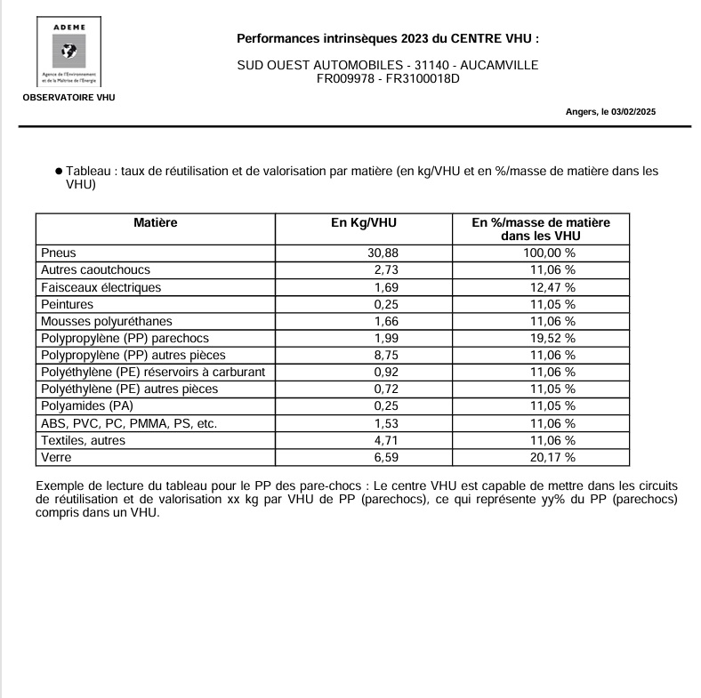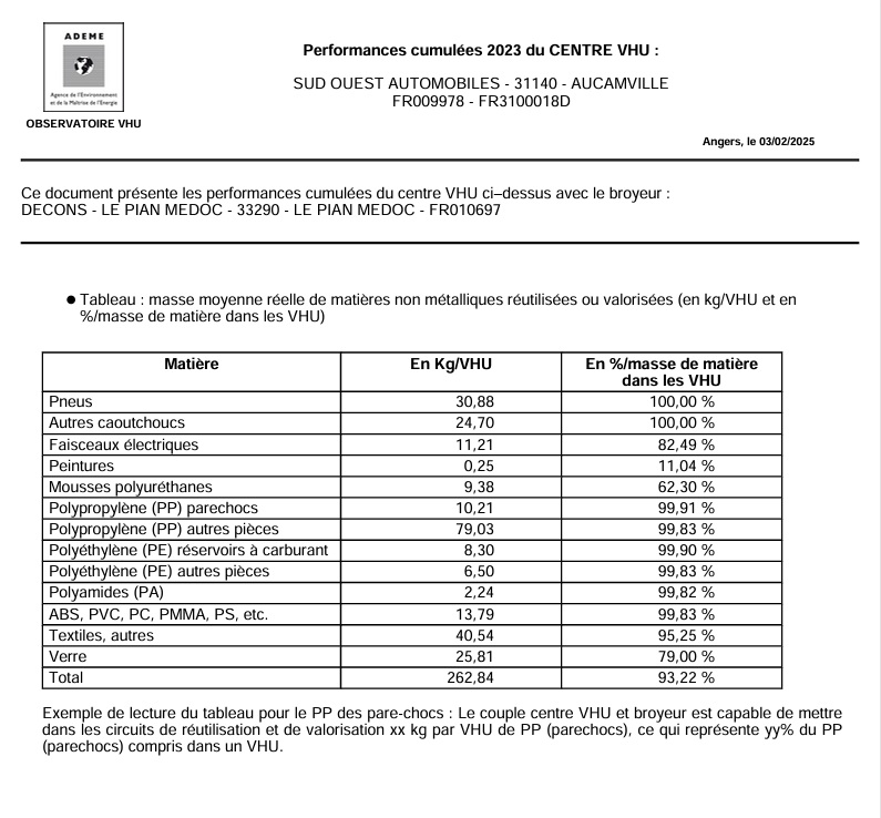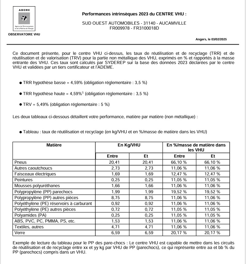 Les taux de recyclage 2023 pour Sud Ouest Autos tels que renseignés à l’ADEME en 2024 sont les suivants :